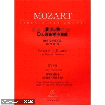 《莫扎特大调钢琴协奏曲》莫扎特大调钢琴协奏曲()基于马里乌斯·弗洛休斯的原作版,该原作版包含在已出版的“新编莫扎特”之中(,;)。在本册用于两架钢琴的缩谱版中,独奏部分没有改编,因而与“新编莫扎特”的版本完全一致。钢琴缩谱部分也遵循于原管弦乐部总谱。