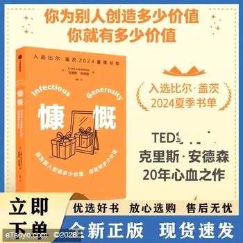 入选比尔·盖茨 夏季书单:“如果你想帮助创造一个更加慷慨的世界,但又不知从何入手,《慷慨》就是一本适合你的书。”舵主年心血之作,分享“值得传播的思想”“慷慨让我感觉自己被看见,我希望別人也感觉被看见,就像我一样。”作为的掌舵人,克里斯·安德森近距离见证了全球富有胆识的思想家分享最振奋人心的理念。受此启发,他坚信在这个日益割裂的时代,我们完全能够化愤慨为乐观,关键在于发挥慷慨这种人类本能的感染力。他通过讲述近个鼓舞人心的故事,为我们呈现了“人类慷慨目前的引人入胜之作”。? 理发师为流浪汉免费理发,如何催生一场社会运动;? 位获赠美元的受资助者,如何将善行传递下去,给更多人带来温暖;? 如何通过免费开放视频资源,将小众的年度峰会转变为全球的思想灯塔,启发了数百万人。更重要的是,克里斯还提供